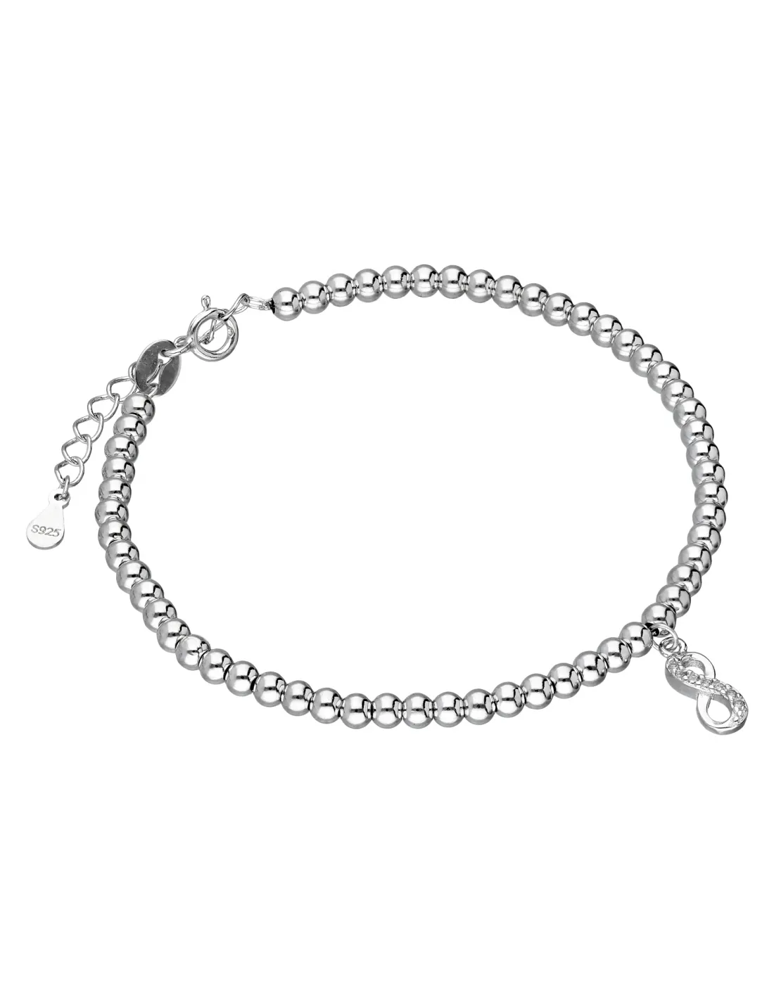 Srebrna bransoletka wieloelementowa ze znakiem nieskończoności; Złożona z gładkich kulek ciasno do siebie przylegających; Element ozdobny wysadzany cyrkoniami; Posiada regulację dzięki czemu dopasujemy ją do każdego rozmiaru nadgarstka; Bransoletka idealnie wpasowuje się w najmodniejsze trendy