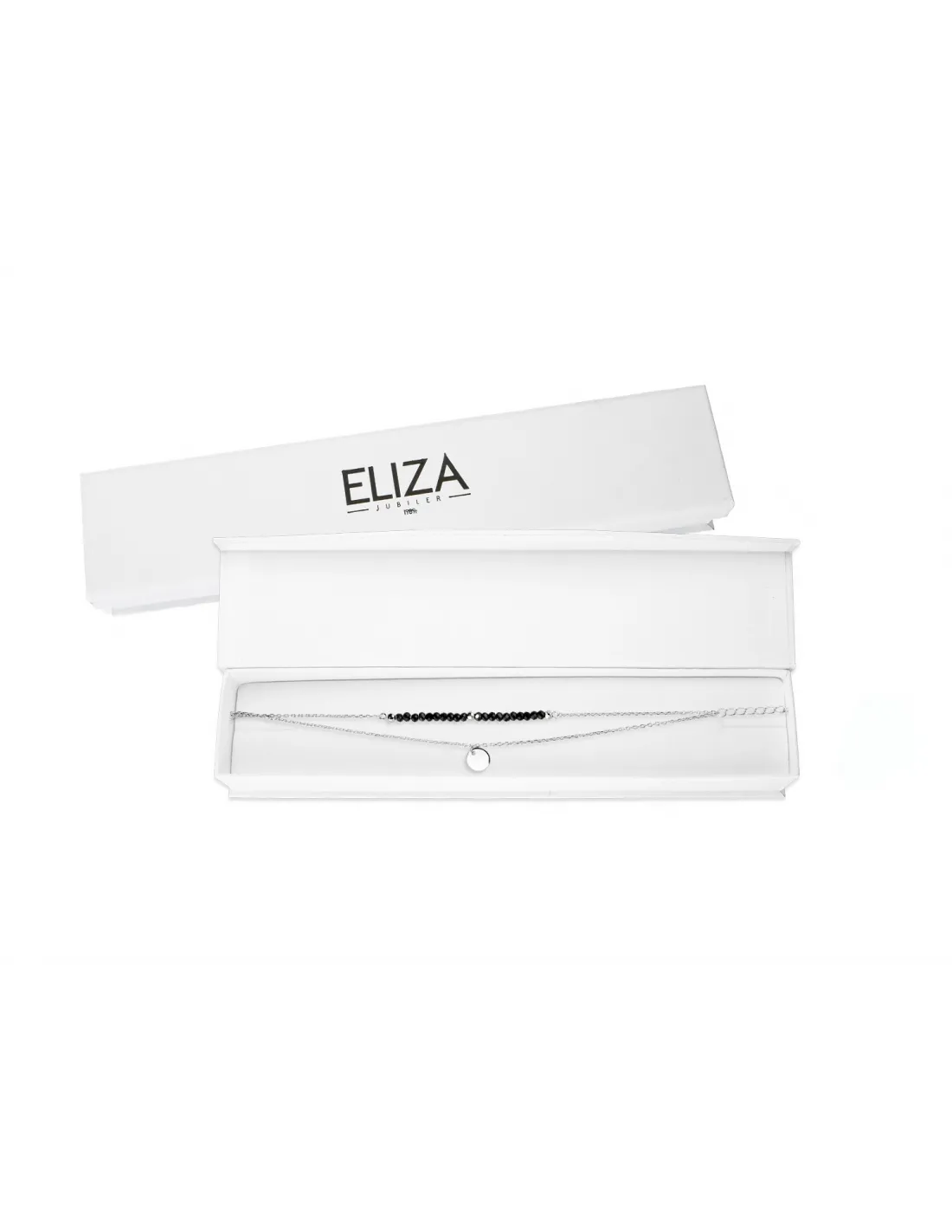 Bransoletka wieloelementowa. Wykonana ze srebra próby 925. Jeden z łańcuszków ozdobiony został płaską blaszką o średnicy 0,7cm. Drugi czarnymi, fasetowanymi cyrkoniami oraz srebrnymi, fasetowanymi kulkami. Delikatny łańcuszek typu ankier wzbogacony został przedłużką.