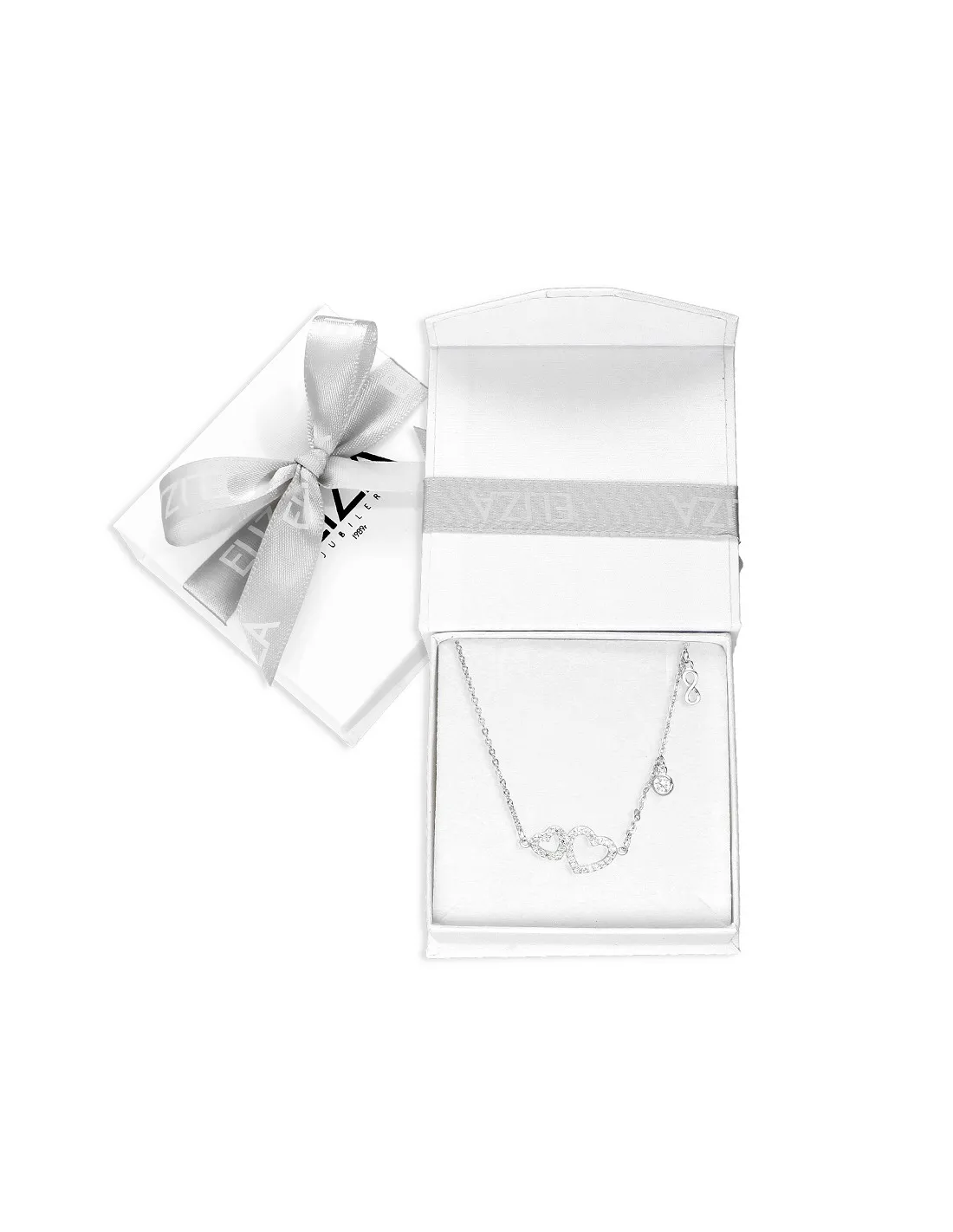 Srebrny naszyjnik typu celebrytka. Wykonany ze srebra próby 925. Elementy ozdobne stanowią podwójne serce wysadzane cyrkoniami, nieskończoność oraz cyrkonia w srebrnej oprawie. Elementy nie przesuwają się po łańcuszku. Delikatny łańcuszek typu ankier. Wzbogacony regulacją, dzięki czemu możemy manipulować jego długością.