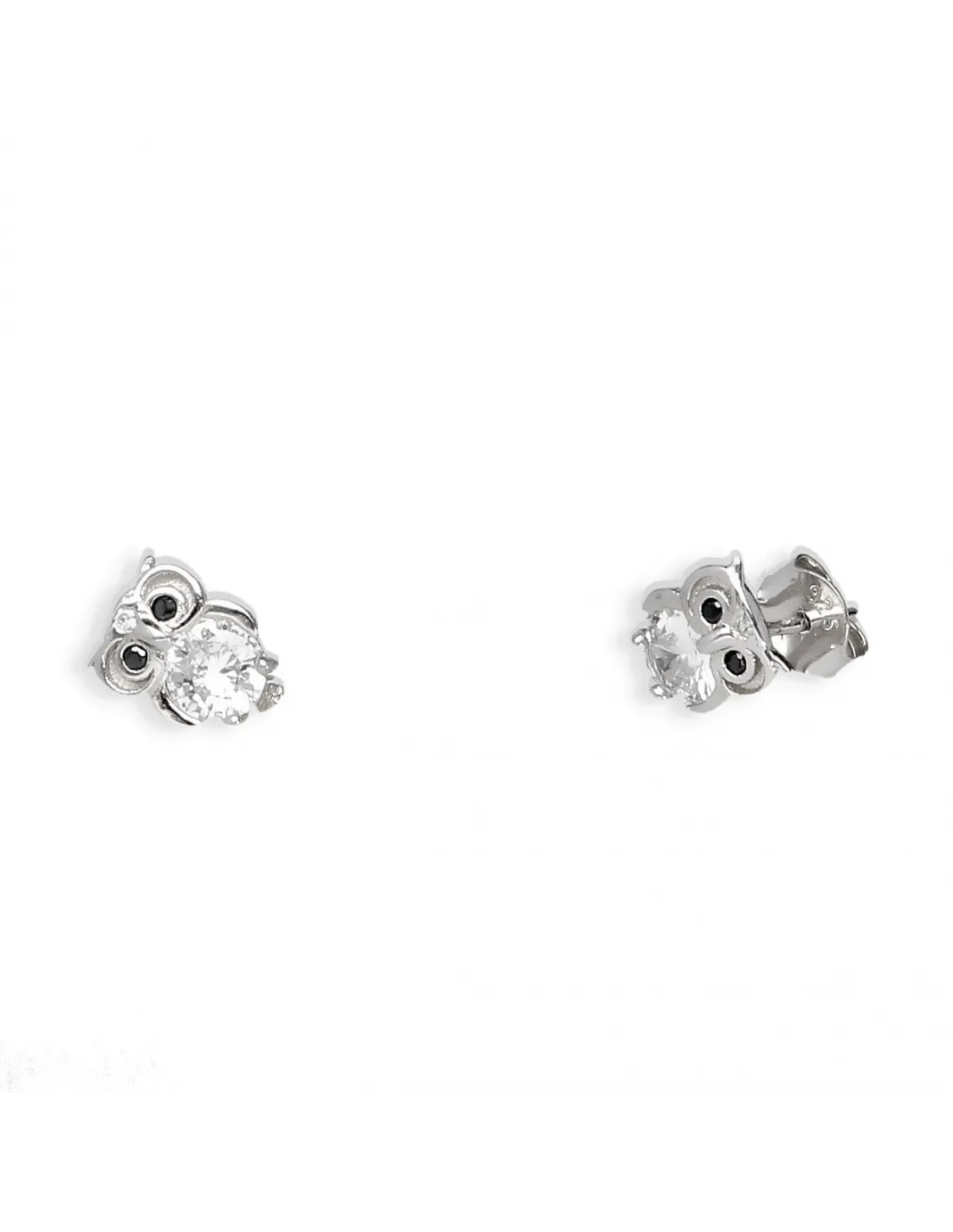 Srebrne kolczyki z motywem sowy. Wykonane ze srebra próby 925. Kolczyki wysadzane białymi i czarnymi cyrkoniami.