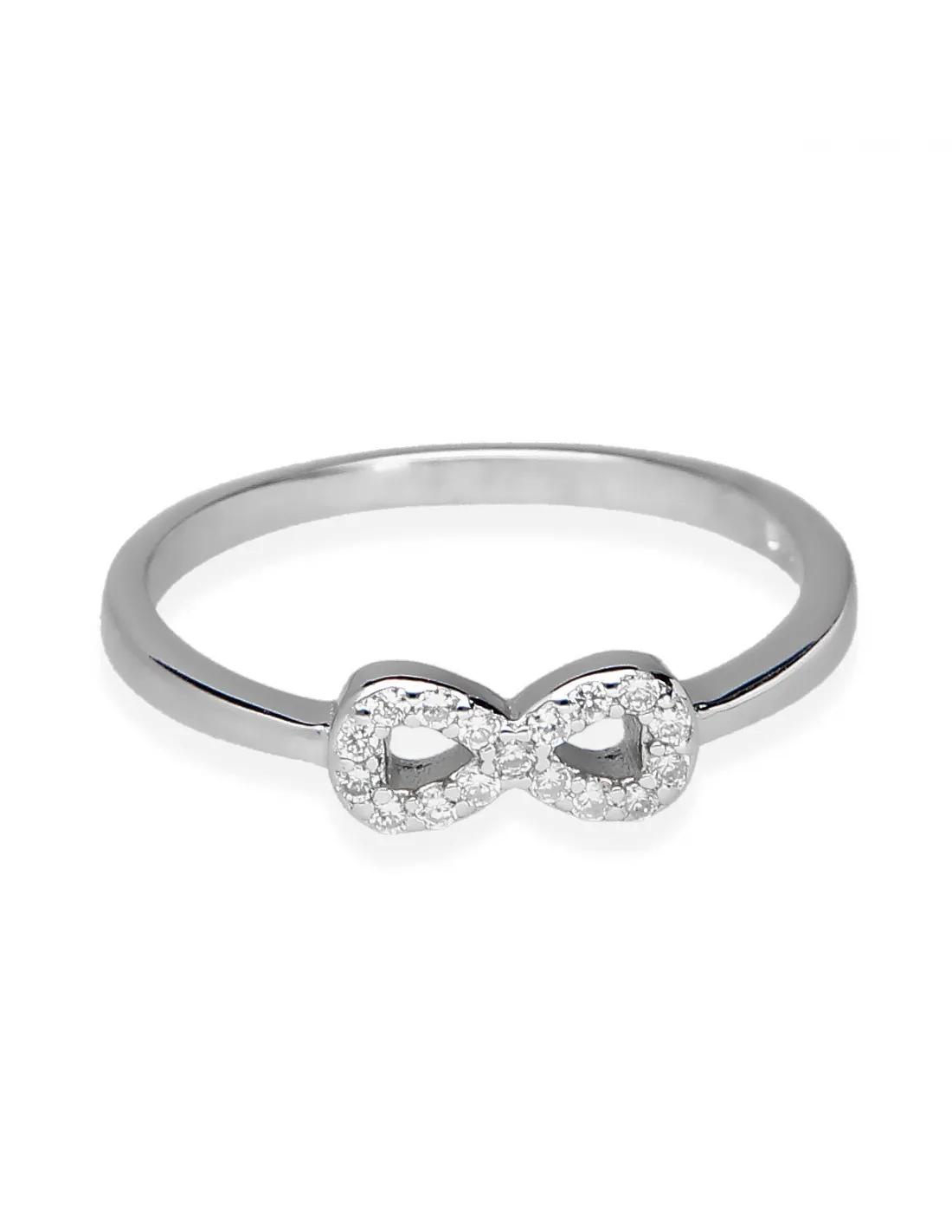 Srebrny pierścionek wykonany ze srebra próby 925 z symbolem nieskończoności. Model o ponadczasowym wyglądzie zdobią białe cyrkonie. Pierścionek idealny do noszenia na co dzień. Delikatny i bardzo kobiecy.