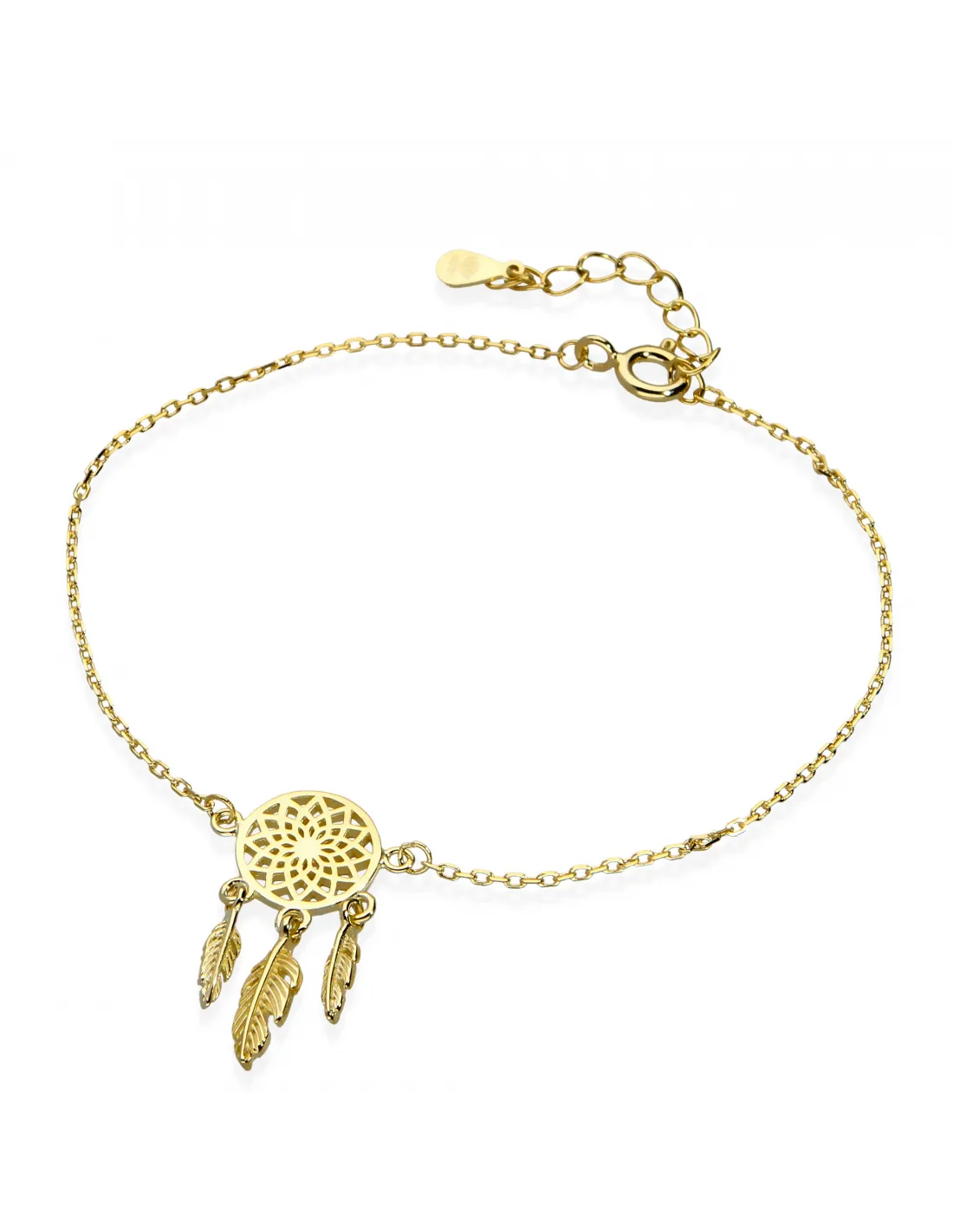 Pozłacana bransoletka wykonana ze srebra próby 925. Delikatna, bransoletka z wiszącym motywem łapacza snów. Doskonale uzupełni każdą stylizację. Idealnie również sprawdzi się na prezent jako talizman szczęścia. Do kompletu naszyjnik o indeksie N4625MP
