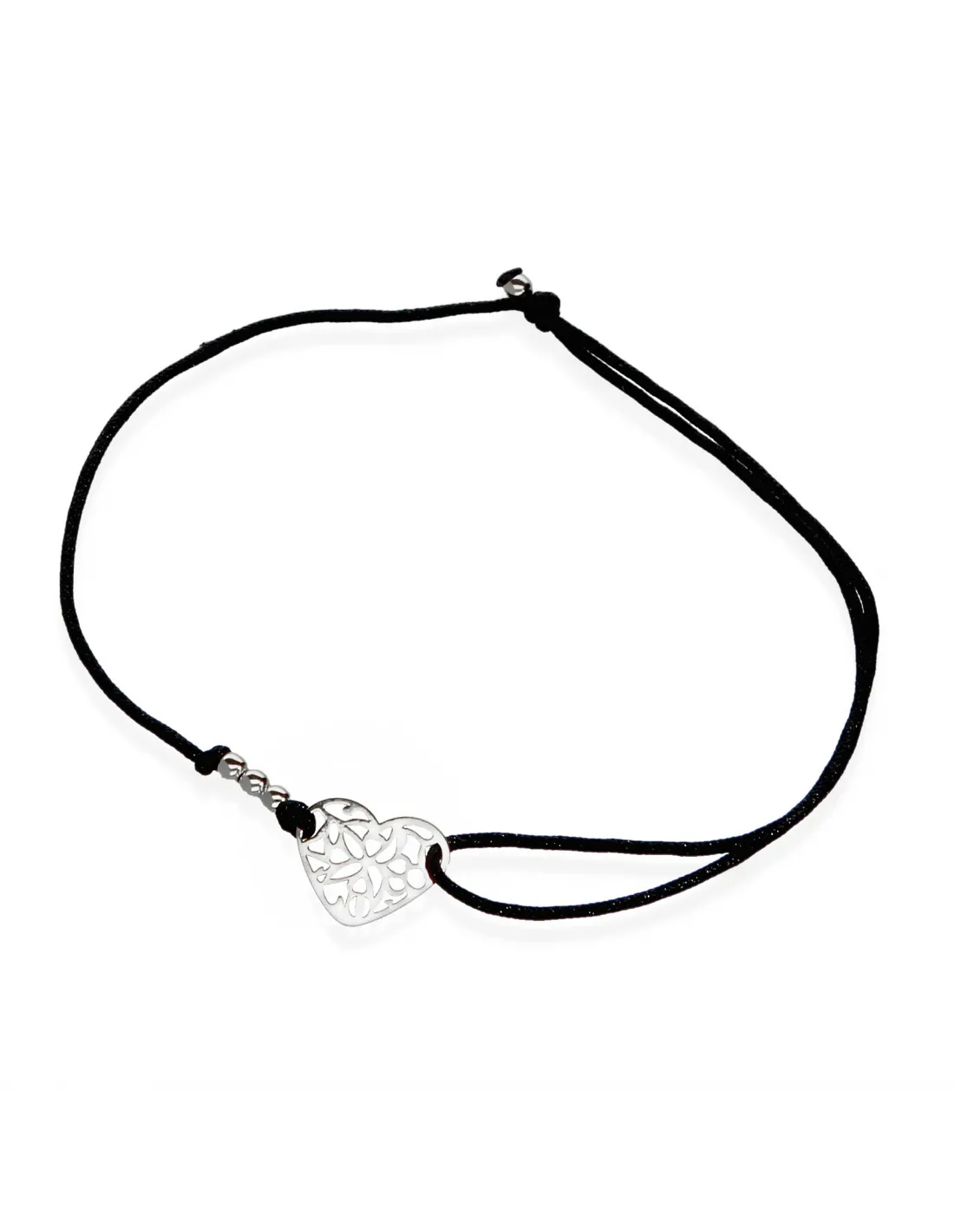Srebrna bransoletka na czerwonym sznurku. Elementem ozdobnym jest serduszko z kuleczkami. Dzięki regulowanemu zapięciu możemy dostosować rozmiar bransoletki do nadgarstka.