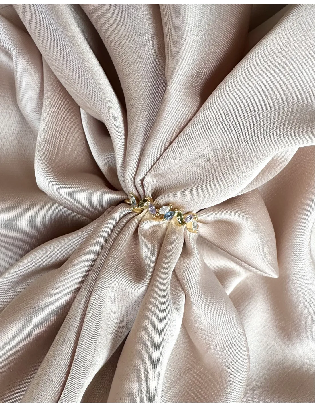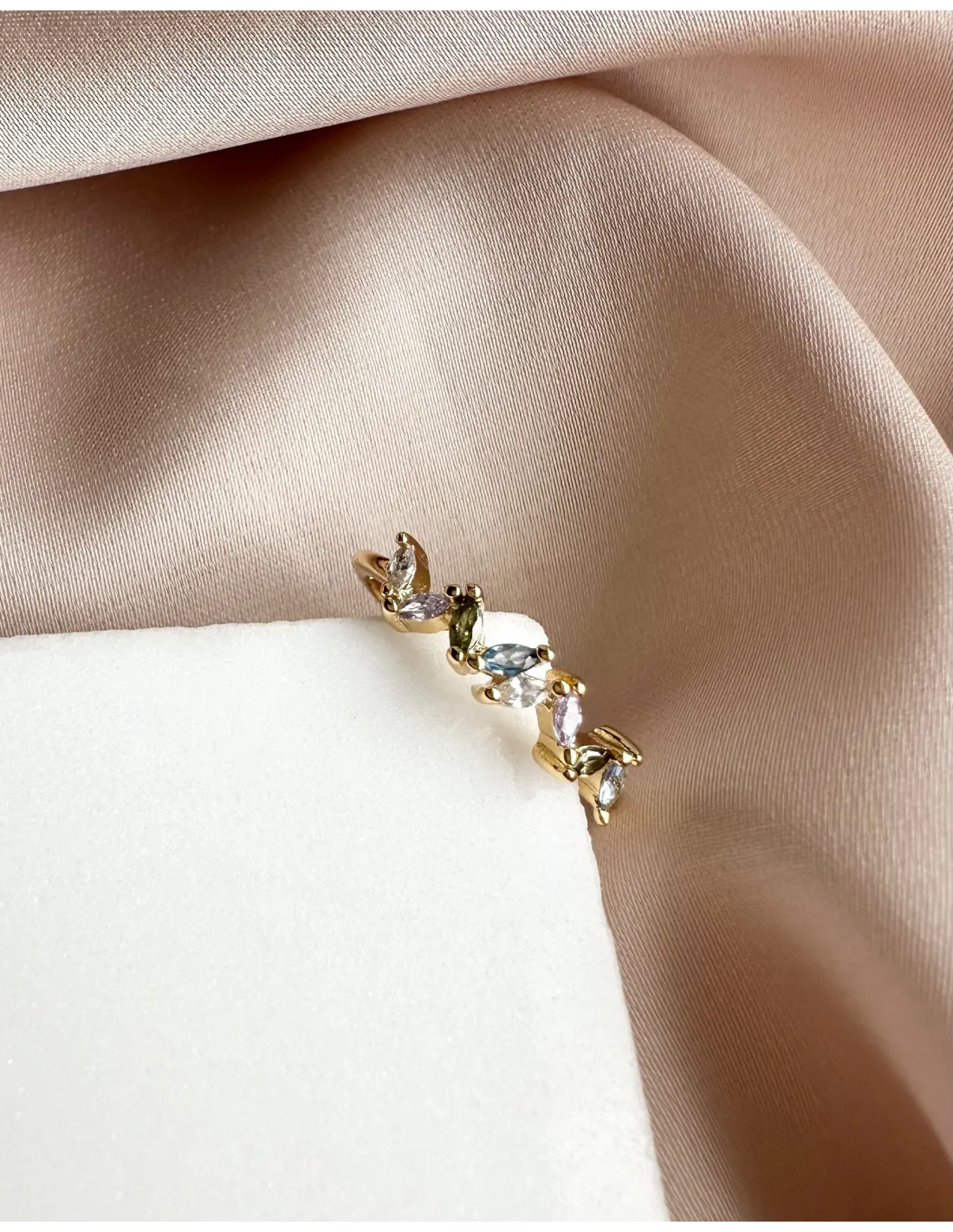 Pierścionek wykonany ze stali szlachetnej z kolorowymi cyrkoniami, ułożonymi na wzór wianka. Pierścionek delikatny, z bardzo kobiecym i modnym motywem. Idealny na prezent.