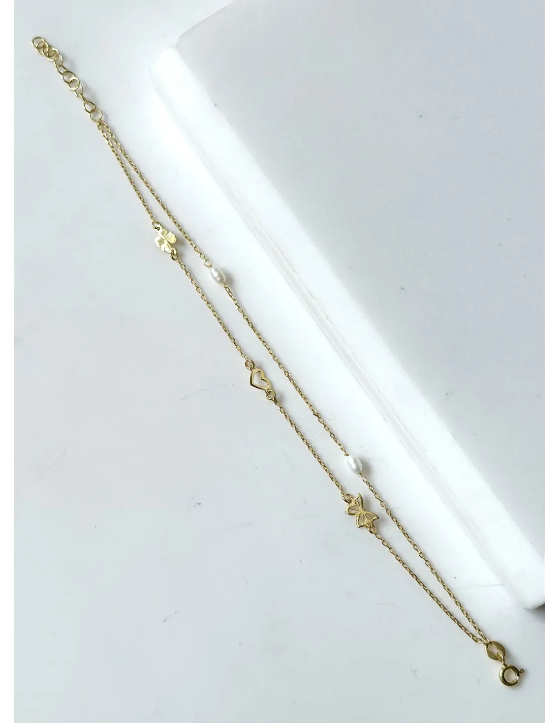 Pozłacana bransoletka wieloelementowa. Zawieszki z motywem koniczyny, serca oraz motylka. Bransoletka wzbogacona została o białe perełki. Przedłużka umożliwia odpowiednie dopasowanie długości. Do kompletu N1324TA