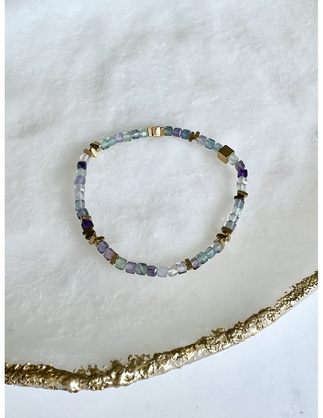 Bransoletka z elementami stali chirurgicznej w złotym kolorze. Wykonany z kamieni naturalnych - FLUORYT TĘCZOWY. Bransoletka na żyłce.