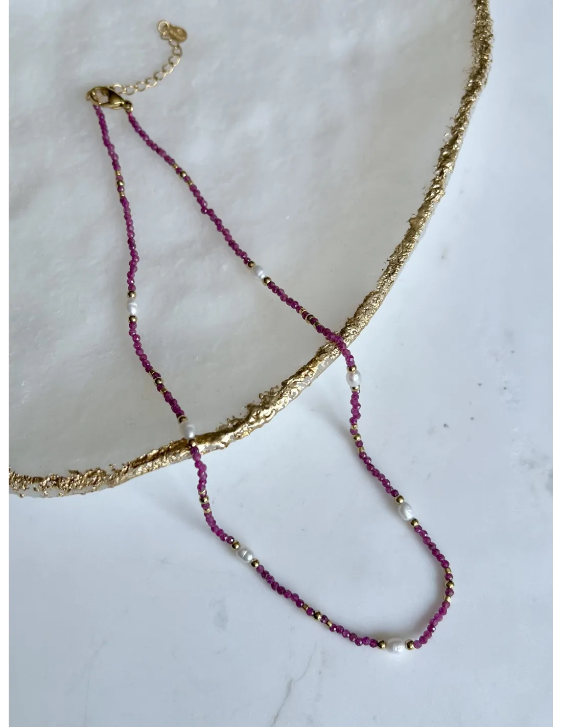 Naszyjnik z elementami stali chirurgicznej w złotym kolorze. Wykonany z kamieni naturalnych - RUBIN. Ozdobiony został również PERŁĄ HODOWLANĄ.