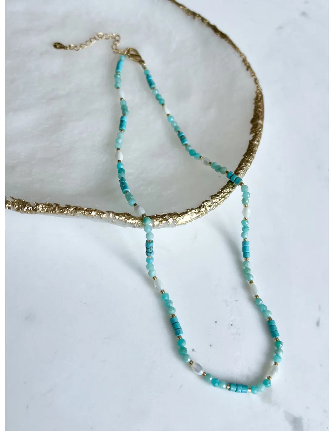Naszyjnik z elementami stali chirurgicznej w złotym kolorze. Wykonany z kamieni naturalnych - AMETYST i Lapis.