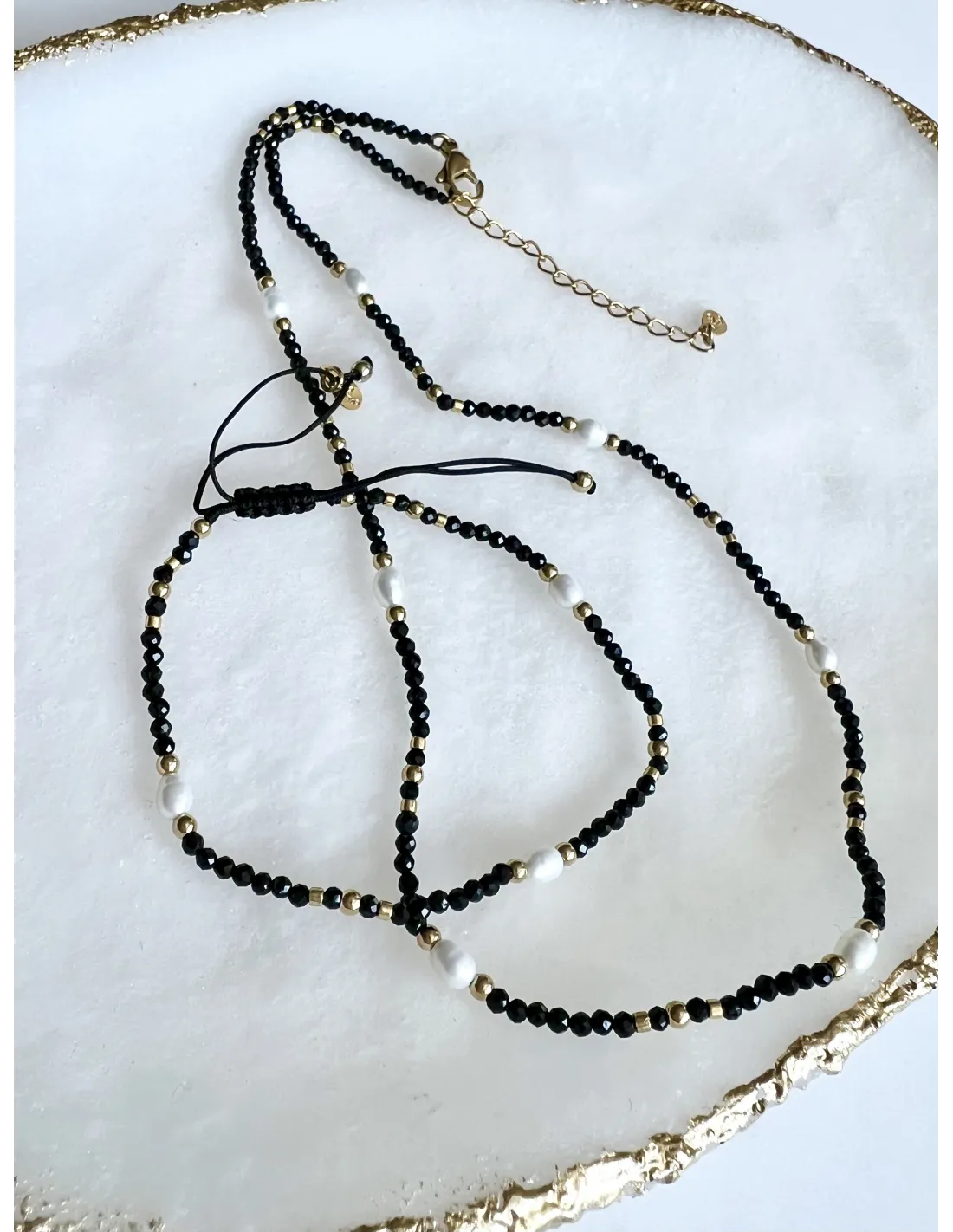 Naszyjnik z elementami stali chirurgicznej w złotym kolorze. Wykonany z kamieni naturalnych - CZARNY TURMALIN. Ozdobiony został również PERŁĄ HODOWLANĄ.